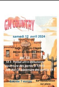 Le Samedi 12 Avril 2025, Bal Country cd chez *G M Country*, à 20h00, Salle Frédéric Chopin, à Bécon les Granits (49370), Maine et Loire.
