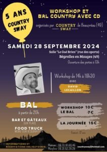 Le Samedi 28 Septembre 2024, Journée Country, organisée par *Country Sway*, à partir de 14h00, avec Workshop de *David Lecaillon* et Bal Country à 20h00, Salle *Le Gué Bri