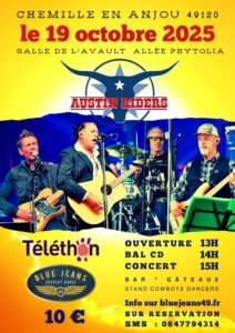 Le Dimanche 19 Octobre 2025, Après Midi Bal Country avec Concert de *Austin Riders*, à 15h00, Salle de L’avault, Allée Phytolia, à Chemille en Anjou (49120), Maine et Loire.