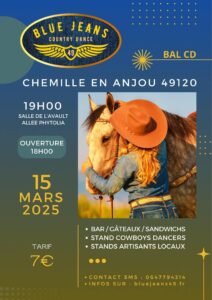 Le Samedi 15 Mars 2025, Bal Country cd des *Blue Jeans Country Dance*, à 19h00, Salle de L’Avault , Allée Phytolia, à Chemille en Anjou (49120), Maine et Loire.