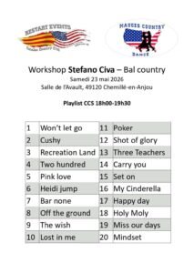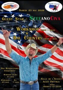 Le Samedi 23 Mai 2026, Journée Country de 14h00 à 01h00, avec Workshop de *Stefano Civa*, et Bal Country , Salle de L’Avault, Allée Phytolia, Chemille en Anjou (4912