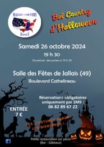 Le Samedi 26 Octobre 2024, Bal Country D’Halloween des *Mauges country Dance*, à 19h30, Salle des Fetes , Boulevard Cathelineau, à Jallais (49), Maine et Loire.