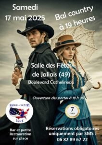 Le Samedi 17 Mai 2025, Bal Country chez *Mauges Country Dance*, à 19h00, Salle des Fetes , Boulevard Cathelineau, à Jallais (49), Maine et Loire.