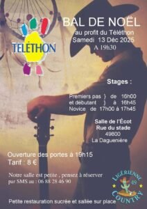 Le Samedi 13 Décembre 2025, Bal Country de Noel pour le Téléthon, chez *Ligérienne Country*, à 19h30, Salle de L’Ecot, rue du Stade, à La Daguenière (49800)