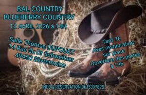 Le Dimanche 12 Avril 2026, Après Midi Bal Country des *Blueberry Country*, à 14h00, Salle Thomas Dupouet, 14 rue du Docteur Schweitzer, à Sèvremoine (49450), Maine et Loire.