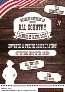 Le Samedi 15 Mars 2025, Bal Country des *Mustang Country 49*, de 20h00 à 02h00, Salle des Fetes, 01, rue des Baraudières, à Varennes sur Loire (49730), Maine et Loire.