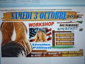 Le Samedi 03 Octobre 2026, Journée Country à partir de 14h00, avec Workshop de *Séverine Fillion* et Bal Country , Salle Jean Eliard, à Bricquebec (50), Manche.