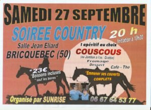 Le Samedi 27 Septembre 2025, Soirée Country organisée par *Sunrise*, à 20h00, Salle Jean Eliard, à Bricquebec (50), Manche.