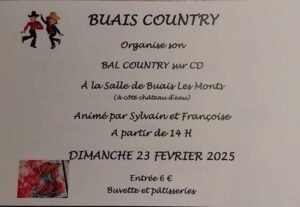 Le Dimanche 23 Février 2025, Après Midi Bal Country cd animé par *Sylvain et Francoise*, chez *Buais Country* à 14h00, Salle de Buais les Monts, à coté du Chateau d’eau, à Buais les Monts (50640), Manche.