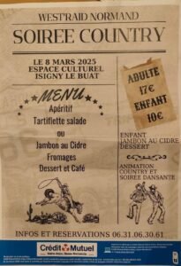 Le Samedi 08 Mars 2025, Soirée Country des *West’raid Normand*, avec Repas et Bal Country, Espace Culturel à Isigny le Buat (50540), Manche.