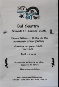 Le Samedi 18 Janvier 2025, Bal Country de *Country Ranch 50*, à 19h30, Espace Culturel, 16, rue du Clos, à Montmartin sur Mer (50590), Manche.