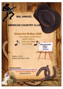 Le Dimanche 09 Mars 2025, Après Midi Bal Country des *American Country Club*, animée par *Caro*, de 14h00 à 18h00, Salle Roger Leprovost, à Ponts (50300), Manche.