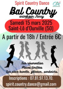 Le Samedi 15 Mars 2025, Bal Country des *Spirit Country Dance*, animé par *Fanny*, à partir de 18h00, à St Lo D’ourville (50) , Manche.