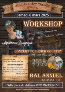 , avec Workshop de *Marianne Langagne*, Concert Pop Rock et Country animé par *Ella Gunn* et Bal annuel cd , Salle Place du Chateau, à Valognes (50700), Manche.
