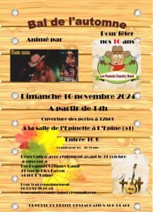 Le Dimanche 10 Novembre 2024, Après Midi Bal Country de L’Automne, pour Feter les 10 ans des *Peanuts Country Band*, avec un Concert de *Frank Silver*, à 14h00
