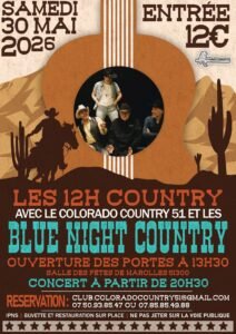 Le Samedi 30 Mai 2026, Journée 12Heures de Country,à partir de 13h30, avec *Le Colorado Country 51* et Concert de *Blue Night Country*