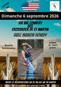 Le Dimanche 06 Septembre 2026, Après Midi 1er Bal Country dess *Crossrock *, avec *Manon Howdy*, à 11h30, Salle des Fetes d