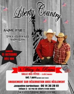 Le Samedi 11 Octobre 2025, Soirée Country des *Liberty Country*, animée par *Toly et Poule Animation*, dès 19h00, Salle des Fetes de Vitry les Reims (51420), Marne.