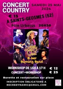 Le Samedi 25 Mai 2024, Journée Country Music et Dance , avec Workshop et Concert de *Lilly West et Her Burning Band*, à 20h30, Pole Urbatus, à St Geosmes (52), Haute Marne.