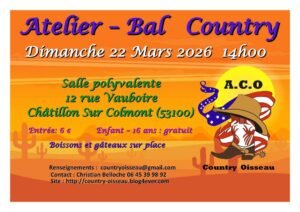 Le Dimanche 22 Mars 2026, Après Midi Atelier et Bal Country chez *Country Oisseau*, à 14h00, Salle Polyvalente, 12 rue Vauboire, à Châtillon sur Colmont (53100), Mayenne.