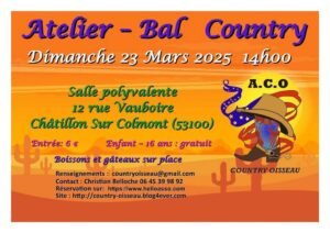 Le Dimanche 23 Mars 2025, Après Midi Bal Country avec Atelier, chez *ACO Country Oisseau*, à 14h00, Salle Polyvalente, 12, rue Vauboire, à Chatillon su