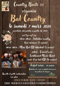 Le Samedi 07 Mars 2026, Bal Country des *Country Boots 53*, à partir de 17h30, avec Initiation, Mini Bal cd et Concert des *Tumbleweed Music Band*, à 20h00, Espace du Maine, à L’Huisserie (53970), Mayenne.