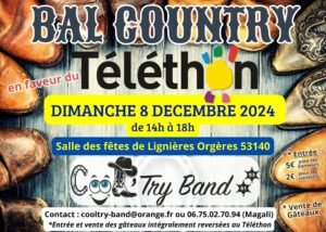 Le Dimanche 08 Décembre 2024, Après Midi Bal Country au profit du Téléthon, chez Cooltry Band*, de 14h00 à 18h00, Salle des Fetes de Lignières Orgères (53140), M