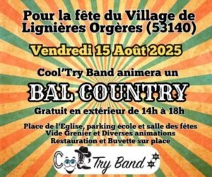Le Vendredi 15 Aout 2025, Après Midi Bal Country animé par *Cool’Try Band*, de 14h00 à 18h00, Place de l’église, à Lignières Orgères (53140), Mayenne.