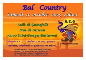 Le Samedi 11 Octobre 2025, Bal Country des *ACO Country Oisseau*, à 20h00, Salle de Guinefolle, rue de Oisseau, à St Gorges Buttavent (53100), Mayenne.