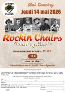 Le Jeudi 14 Mai 2026, Bal Country chez *Country Station*, à partir de 13h00 avec Concert des *Rockin’Chairs Country Music*, Salle des Fêtes, 26 rue Philippe Martin, à