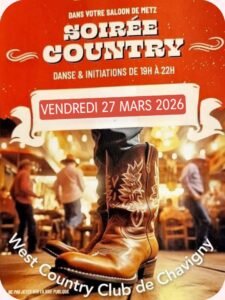 Le Vendredi 27 Mars 2026, Soirée Country des *West Country Club de Chavigny*, de 19h00 à 22h00, avec Danse et Initiations, dans votre Sallon de Metz.