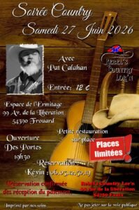 Le Samedi 27 Juin 2026, Soirée Country avec Concert de *Pat Calahan*, chez *Rebel’s Country Lor’n*, à 19h30, Espace de L’Ermitage, 99 Avenue de la Libéra