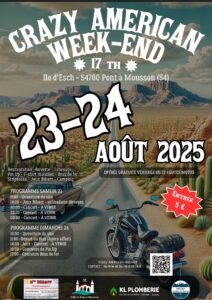 Les 23 et 24 Aout 2025, aura lieu le *Crazy American Week End*, Ile D’Esch, à Pont à Mousson (54700), Meurthe et Moselle .