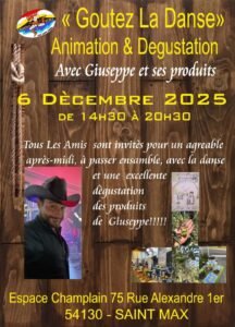 Le Samedi 06 Décembre 2025, Après Midi Country avec *Giuseppe *, de 14h30 à 20h30, Espace Champlain, 75 rue Alexandre 1er, à Saint Max (54130), Meurthe et Moselle.