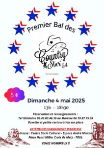 Le Dimanche 04 Mai 2025, 1er Après Midi Bal Country des *Country Star 54*, de 13h00 à 18h30, Centre Socio Culturel, Espace André Malraux, Place Henri Miller Croix de Metz, à Toul (
