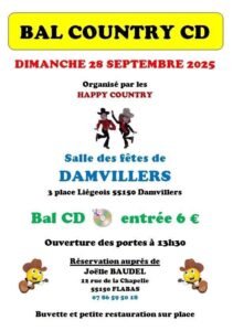 Le Dimanche 28 Septembre 2025, Après Midi Bal Country cd chez *Happy Country*, Salle des Fetes, 3 Place Liégeois, à Damvillers (55150), Meuse.