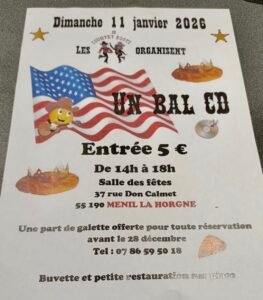 Le Dimanche 11 Janvier 2026, Après Midi Bal Country cd de la Galette, de 14h00 à 18h00, chez *Les Country Boots*, Salle des Fêtes, 37 rue Don Calmet, à Menil la Horgne (55190), Meuse.