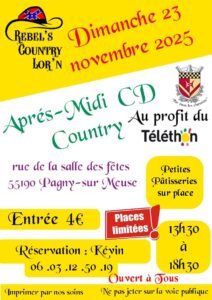 Le Dimanche 23 Novembre 2025, Après Midi Bal Country cd au profit du Téléthon, chez *Rebel’s Country Lor’n*, de 13h30 à 18h30, rue de la Salle des Fetes,