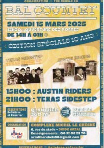 Le Samedi 15 Mars 2025, Journée Country de 14h00 à 01h00, avec Plancher de 360 m² et Concerts de *Texas Sidestep * et *Austin Riders*, au Complexe Michel le Chesne, 06, ru