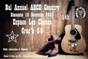 Le Dimanche 16 Novembre 2025, Après Midi Bal Country annuel à 14h00, chez *ADCD Country*, Espace Les Chenes, à Crac’h (56) Morbihan.