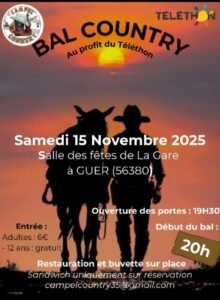 Le Samedi 15 Novembre 2025, Bal Country des *Campel Country*, pour le Téléthon, à 20h00, Salle des Fetes de la Gare, à Guer (56380), Morbihan.