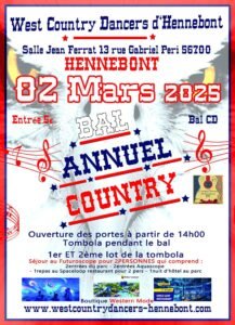 Le Dimanche 02 Mars 2025, Après Midi Bal Country annuel cd, à 14h00, Salle Jean Ferrat, 13, rue Gabriel Peri, à Hennebont (56700), Morbihan.