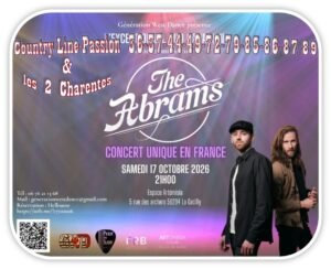 Le Samedi 17 Octobre 2026, Soirée proposée par *Country Line Passion & les 2 Charentes*, avec Concert unique en France des *The Abrams*, à 21h00, Espace Artémisia, 5 rue des Archers, à La Gacilly (5