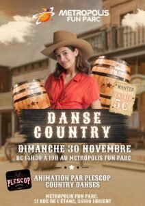 Le Dimanche 30 Novembre 2025, Après Midi Country Danse des *Plescop Country Danses *de 14h30 à 19h00, au Metropolis Fun Parc, 21 rue de L’étang, à Lorient (56100), Morbihan.