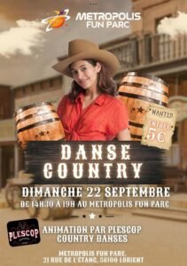 Le Dimanche 22 Septembre 2024, Après Midi Bal Country , de 14h30 à 19h00, au Metropolis Fun Parc, 21, rue de L’etang, à Lorient (56100), Morbihan.