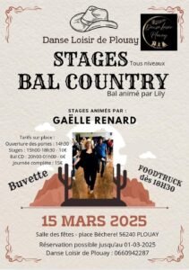 Le Samedi 15 Mars 2025, Journée Country animée par *Lily*, chez *Danse Loisir *, avec Stages animés par *Gaelle Renard* de 15h00 à 18h30 et Bal Country cd de 20h00 à 01h00, Salle de