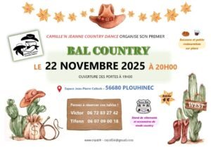 Le Samedi 22 Novembre 2025, 1er Bal Country des *Camille’N Jeanne Country Dance*, à 20h00, Espace Jean Pierre Calloch, à Plouhinec (56680), Morbihan.