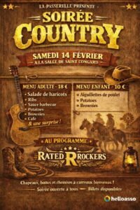Le Samedi 14 Février 2026, Soirée Country de *La Passerelle*, Salle de St Congard (56140), Morbihan.