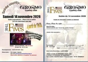 Le Samedi 14 Novembre 2026, Soirée Country avec Concert de *The Fives*, chez *Geronimo Country Club*, à 19h30, Salle Polyvalente, Place de la Saline, à Chateau Salins (57170), Mose