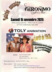 Le Samedi 15 Novembre 2025, Soirée Country chez *Geronimo Country Club*, à 19h30, Salle Polyvalente, Place de la Saline à Chateau Salins (57170) , Moselle.